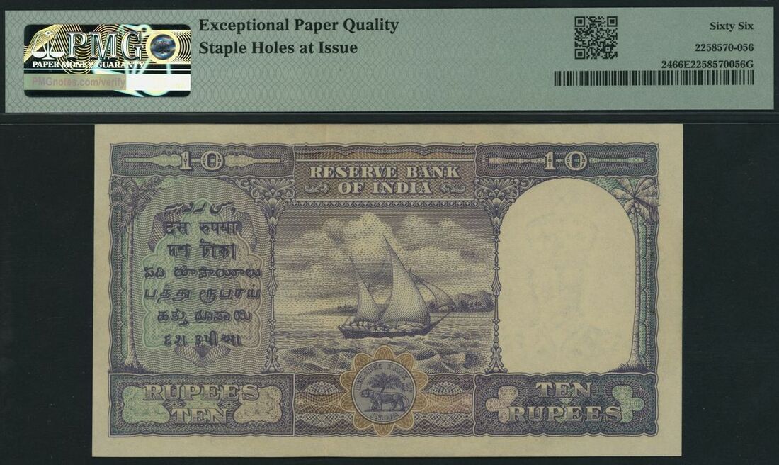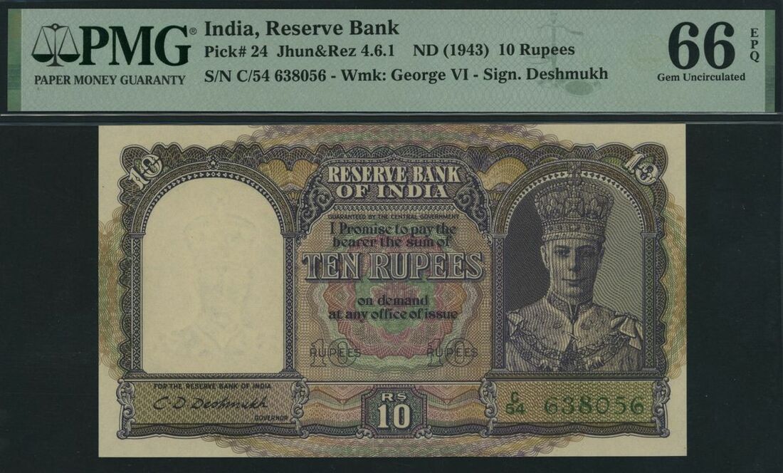 Reserve Bank of India, 10 Rupees, ND (1943), serial number C/54 638056, Deshmukh signature, (Pick 24, Jhun&Rez 4.6.1), in PMG holder 66 EPQ Gem Uncirculated, staple holes at issue