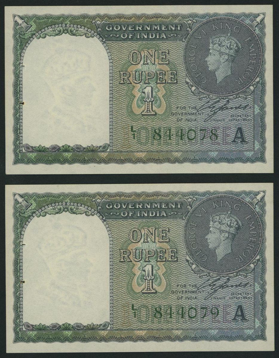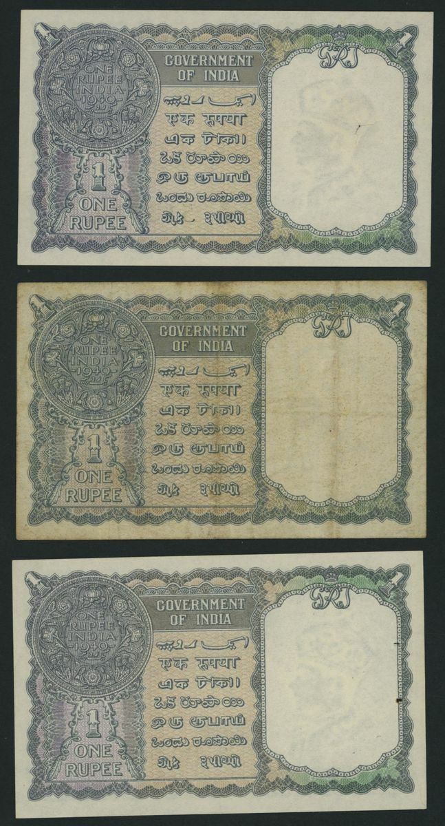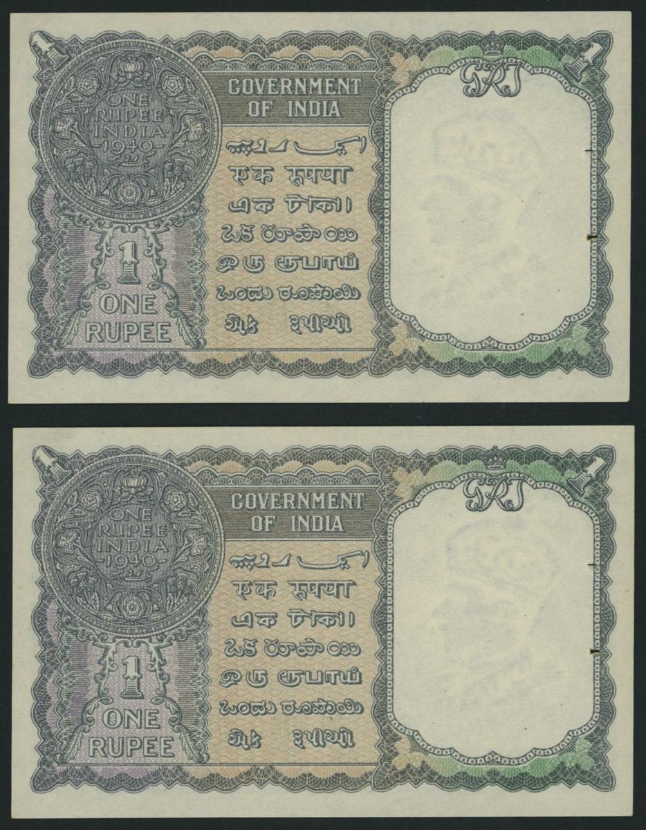 (x) Government of India, [5 notes] 1 Rupee, 1940, black serial numbers V/21 513317 and V/29 259106 and green consecutive serial numbers L/1 844077-9,