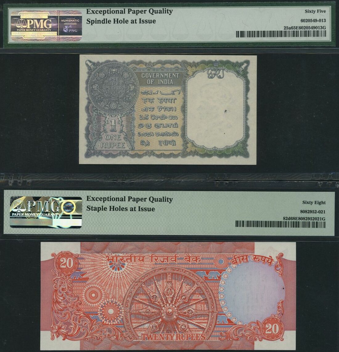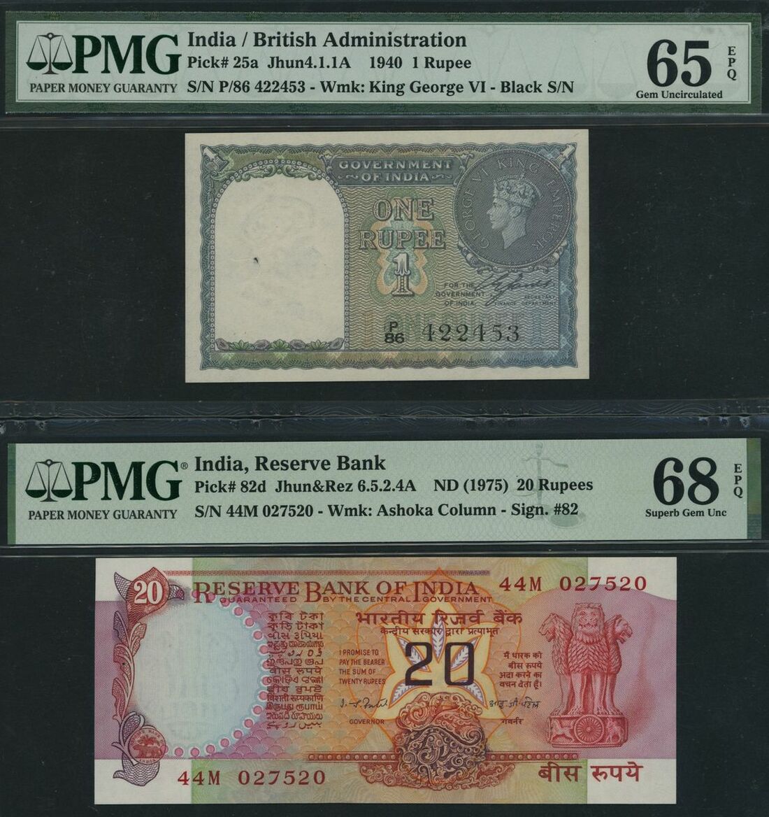 (Pick 25a, 82d, BNB 151a, 263d1), in PMG holders 65 EPQ Gem Uncirculated and 68 EPQ Superb Gem Uncirculated, 20 Rupee note is the single finest graded on PMG Census (2 notes)