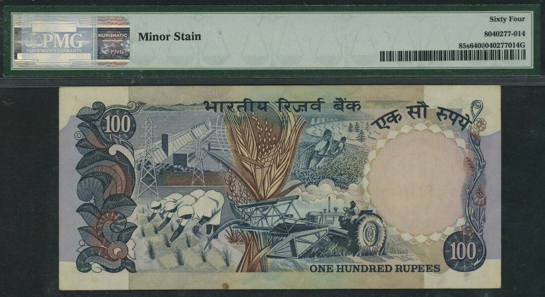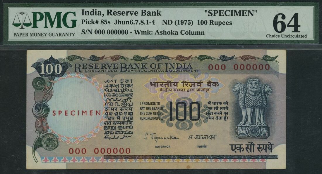 (x) Reserve Bank of India, specimen 100 Rupees, ND (1975), serial number 000 000000, (Pick 85s, BNB 267as), in PMG holder 64 Choice Uncirculated, only 7 notes in higher grade on PMG Census, minor stain