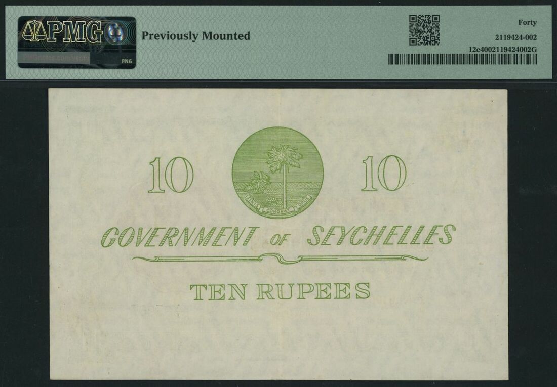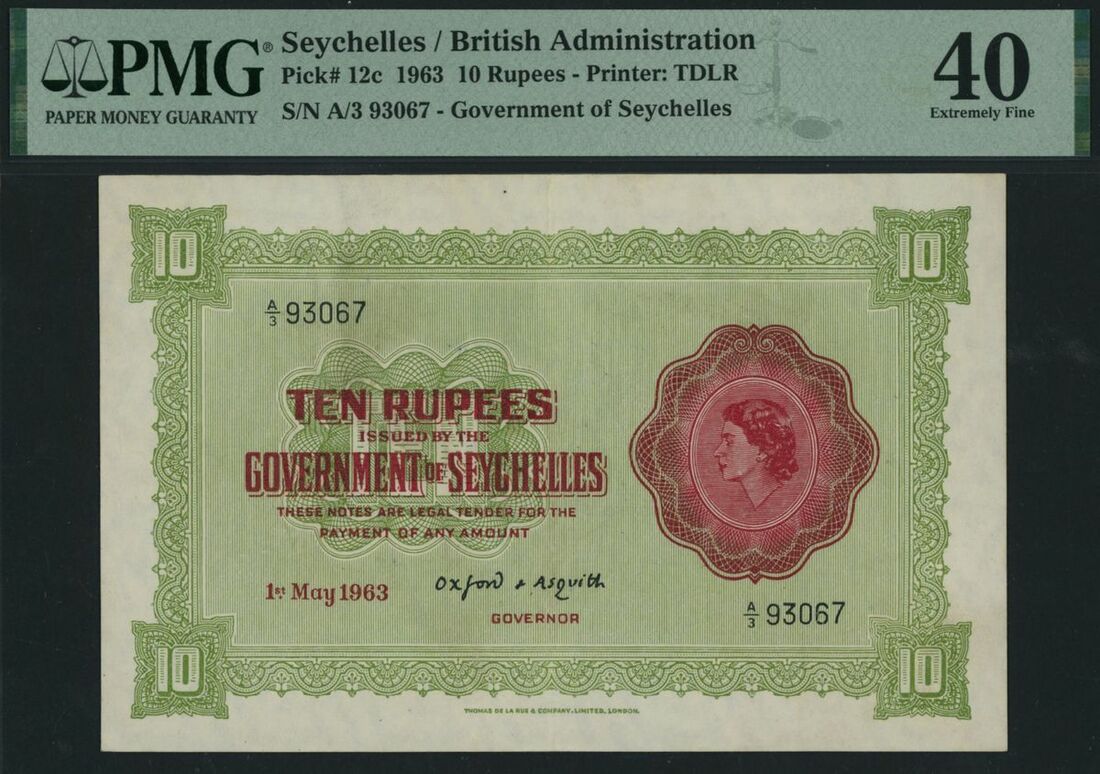 (x) Government of Seychelles, 10 Rupees, 1st May 1963, serial number A/3 93067, (Pick 12c, BNB 119), in PMG holder 40 Extremely Fine