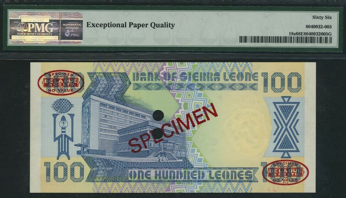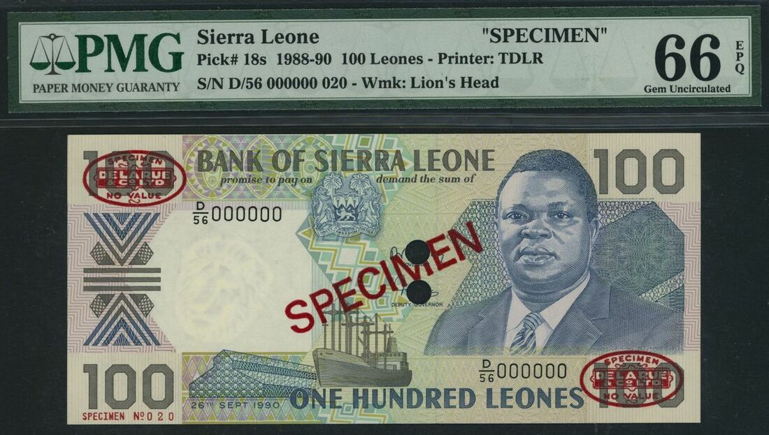 (x) Bank of Sierra Leone, specimen 100 Leones, 26th September 1990, serial number D/56 000000, specimen number 020, (Pick 18s, BNB 113as), in PMG holder 66 EPQ Gem Uncirculated