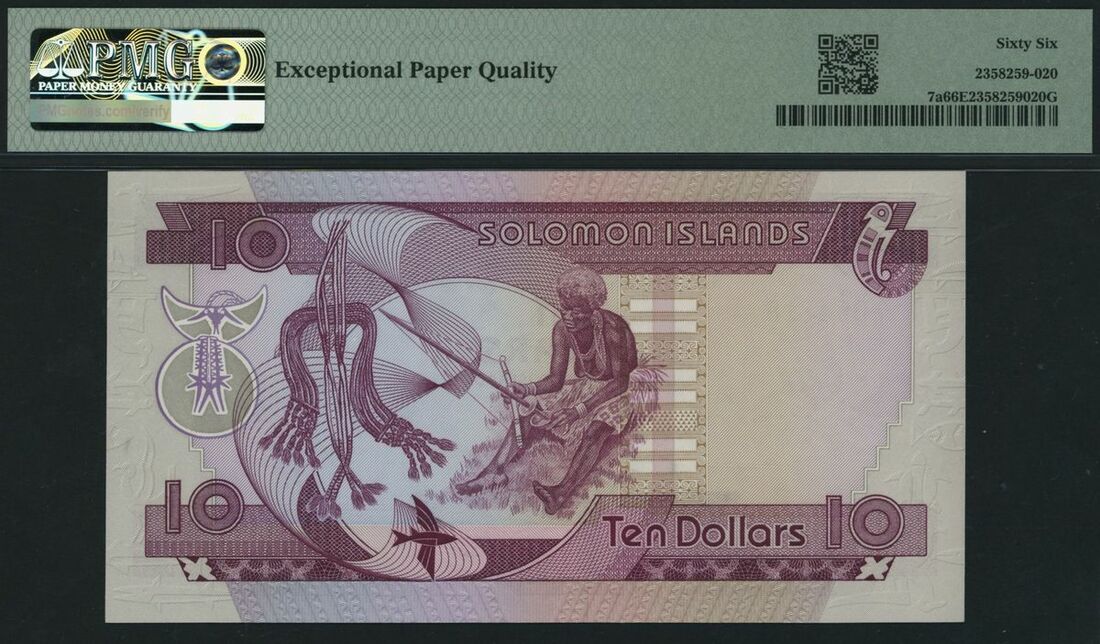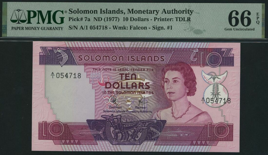 (x) Monetary Authority, Solomon Islands, 10 Dollars, ND (1977), serial number A/1 054718, (Pick 7a, BNB 103), in PMG holder 66 EPQ Gem Uncirculated
