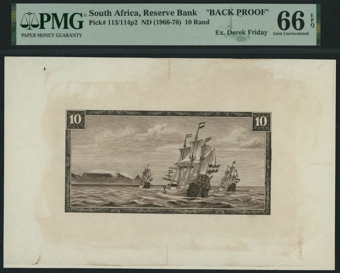 (x) Reserve Bank, South Africa, [Back Proof] 10 Rand, ND (1966-76), no serial number, (Pick 113/114p2), in PMG holder 66 EPQ Gem Uncirculated, selvage included