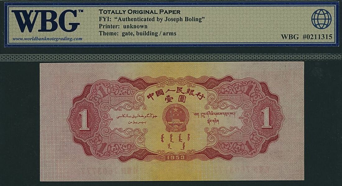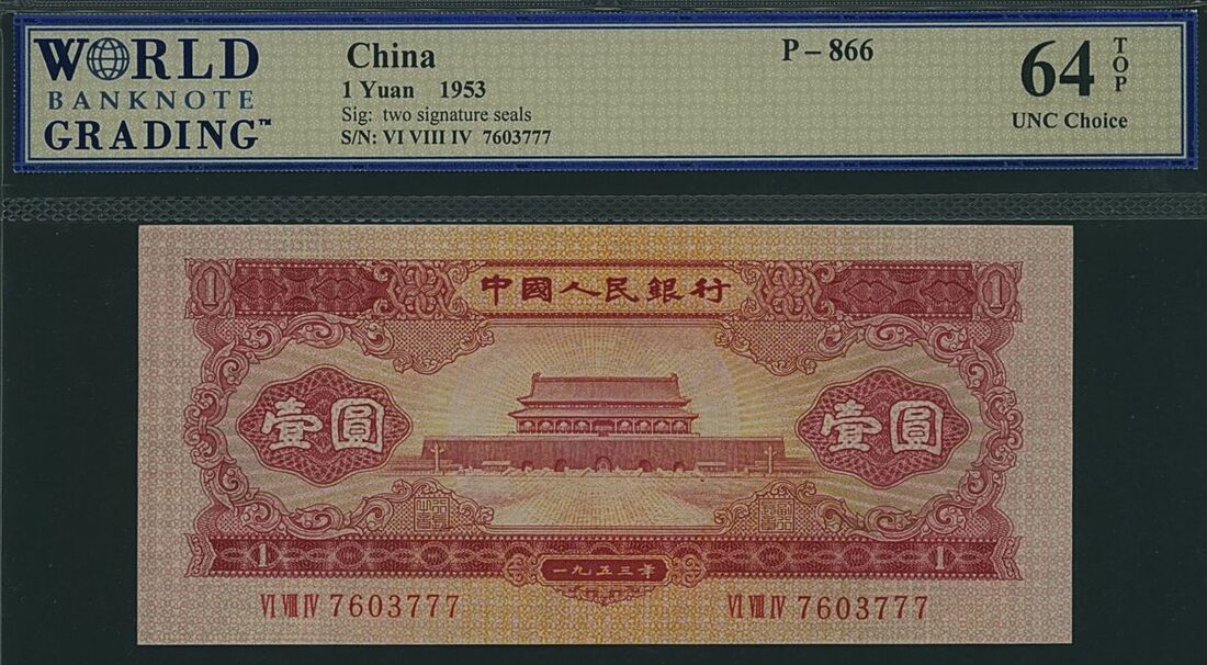 People's Bank of China, 1 Yuan, 1953, serial number 7603777, (Pick 866, BNB 4078), in WBG holder 64 TOP Uncirculated Choice