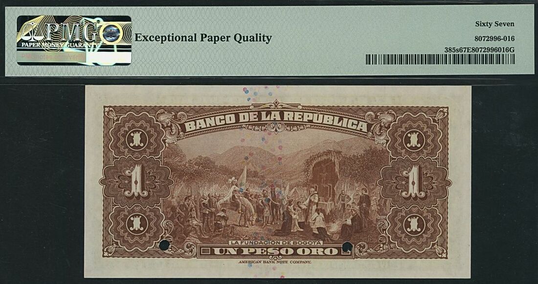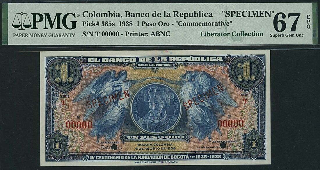 Banco de la Republica, Colombia, [TOP POP] specimen Commemorative 1 Peso Oro, 6th August 1938, serial number T 00000, (Pick 385s, BNB 934), in PMG holder 67 EPQ Superb Gem Uncirculated, only note in its grade and highest graded on PMG Census