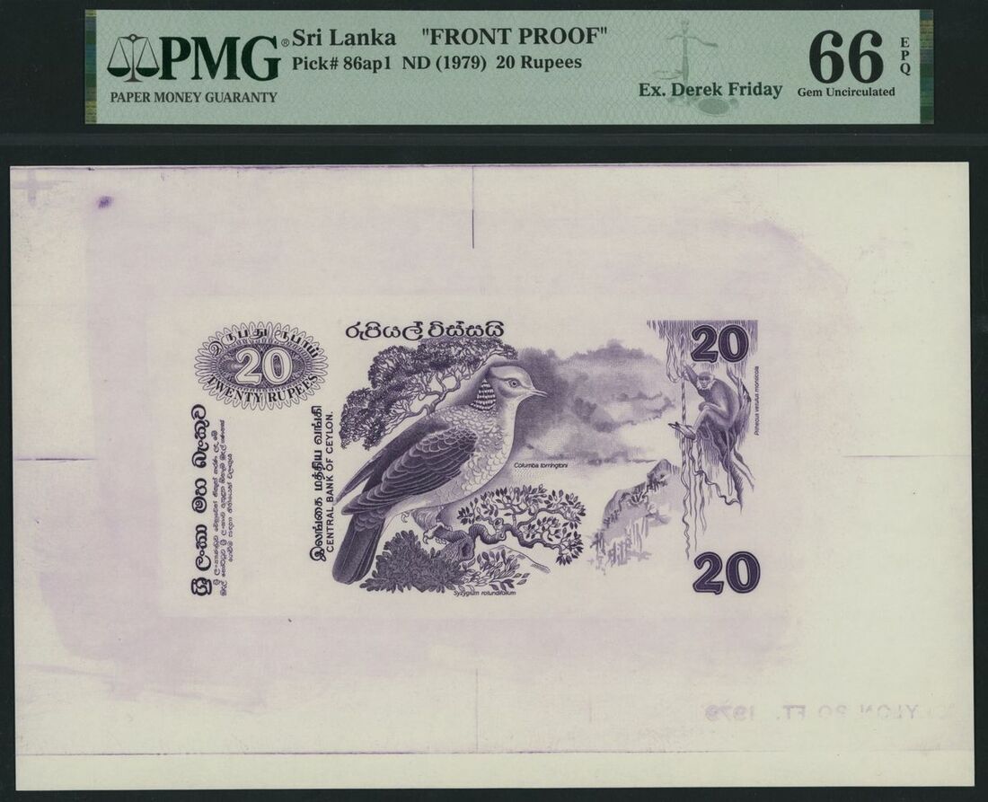 (x) Sri Lanka, [Front Proof] 20 Rupees, ND (1979), no serial number, (Pick 86ap1), in PMG holder 66 EPQ Gem Uncirculated, selvage included