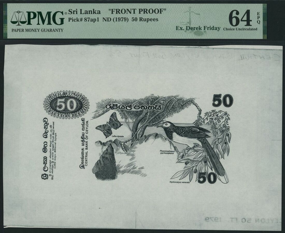 (x) Sri Lanka, [Front Proof] 50 Rupees, ND (1979), no serial number, (Pick 87ap1), in PMG holder 64 EPQ Choice Uncirculated, selvage included