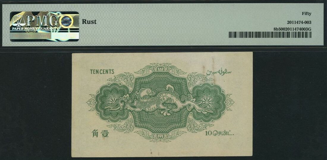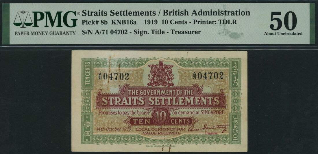 (x) Government of the Straits Settlements, 10 Cents, Singapore, 14th October 1919, serial number A/71 04702, (Pick 8b, BNB 117), in PMG holder 50 About Uncirculated, rust