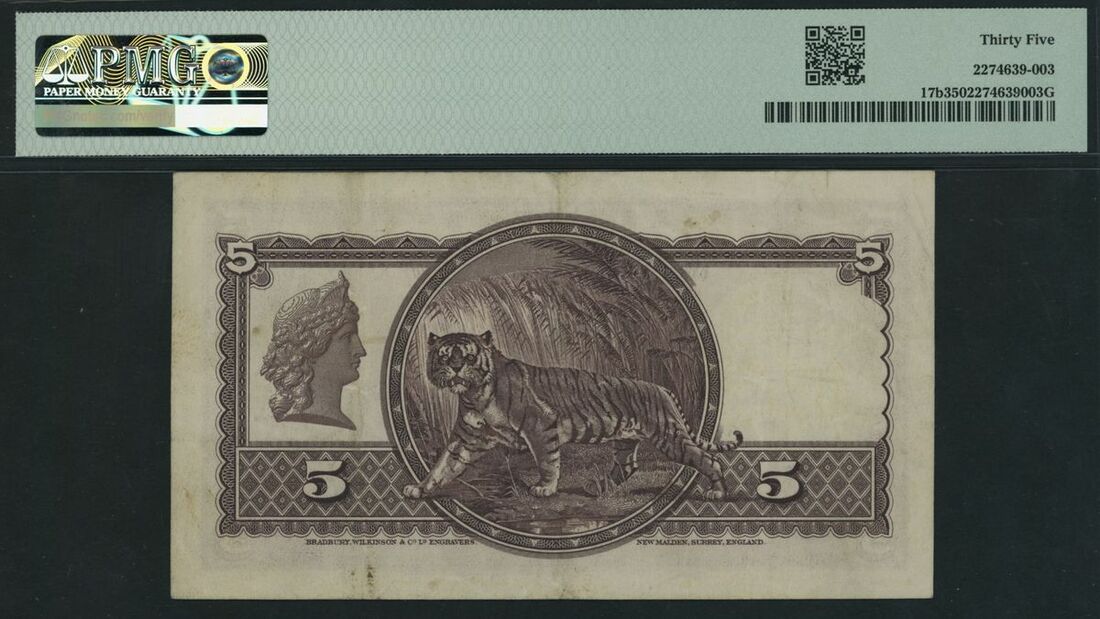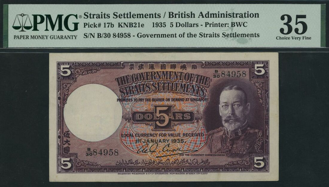 (x) Government of the Straits Settlements, 5 Dollars, 1st January 1935, serial number B/30 84958, (Pick 17b, BNB 122e), in PMG holder 35 Choice Very Fine