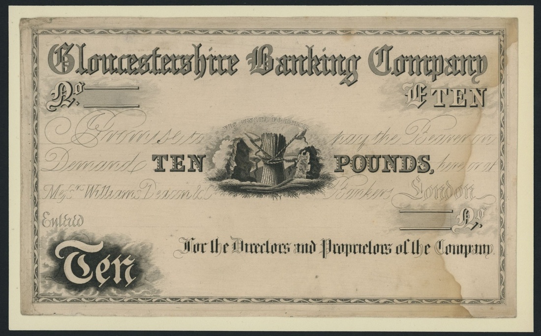 Gloucestershire Banking Company, progressive proof £10, no branch named, 184-, Gloucestershire Banking Company had a number of issuing branches. No branch is named on this banknote but the Head Office for the Gloucestershire Banking Company is in Gloucester, which is listed in Outing 828 circa. 1831-1882, uniface,
