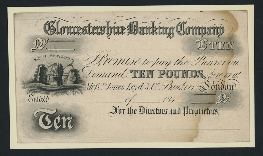Gloucestershire Banking Company, proof £10, no branch named, 184-, Gloucestershire Banking Company had a number of issuing branches. No branch is named on this banknote but the Head Office for the Gloucestershire Banking Company is in Gloucester, which is listed in Outing 828 circa. 1831-1882, uniface,
