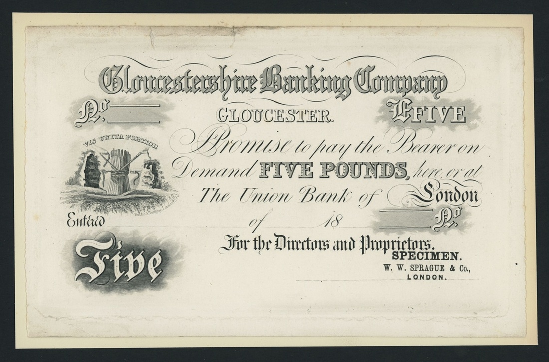 Gloucestershire Banking Company, specimen £5, Gloucester, dated 18--, stamped 'SPECIMEN W. W. SPRAGUE & CO.', uniface,