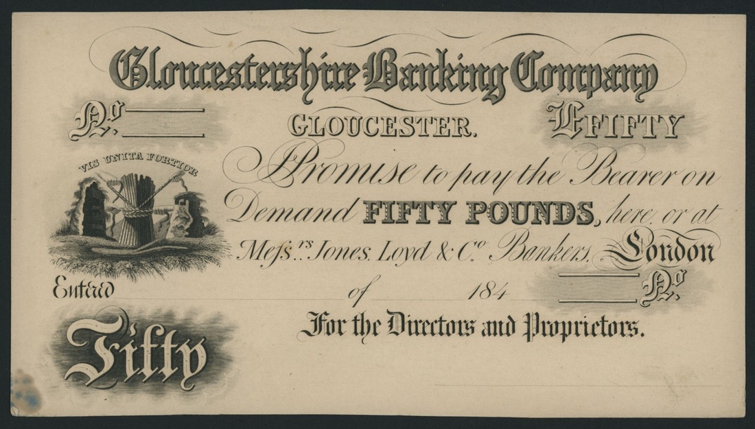 Gloucestershire Banking Company, proof £50, Gloucester, dated 184-, denomination unlisted, uniface,