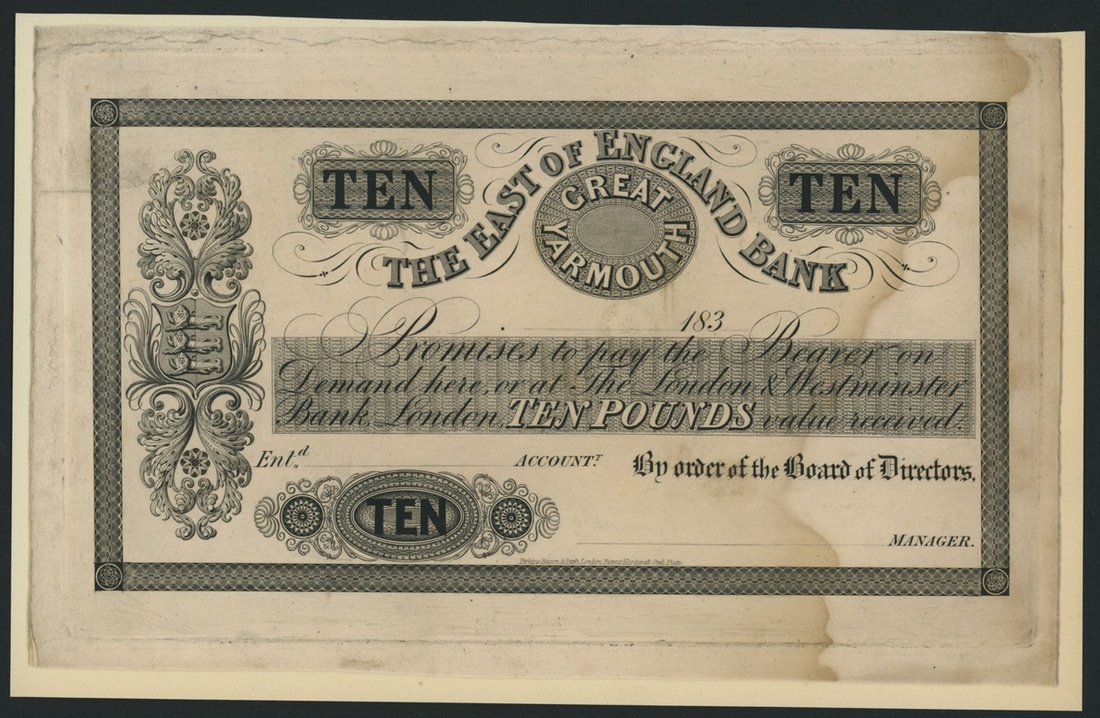 The East of England Bank, proof £10, Great Yarmouth, dated 183-,