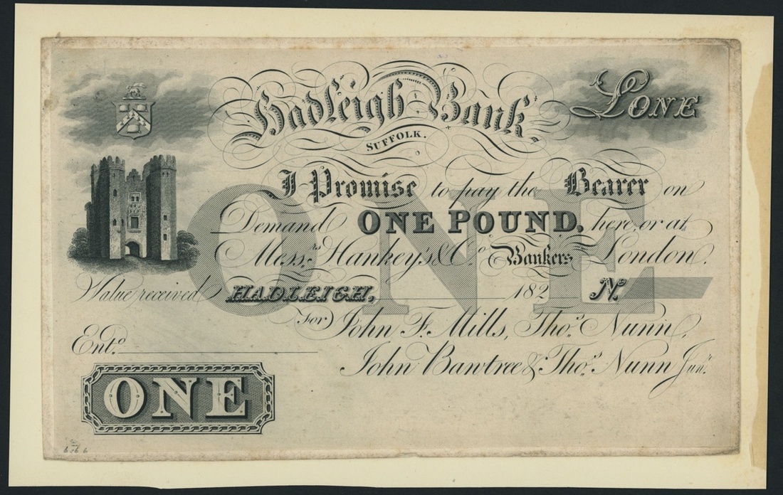 Hadleigh Bank, proof £1, Hadleigh, dated 182-, John F Mills, Thomas Nunn, John Bawtree & Thomas Nunn Junior are listed circa. 1820 under Outing 867 with no trading name but in association with Hadleigh, uniface,