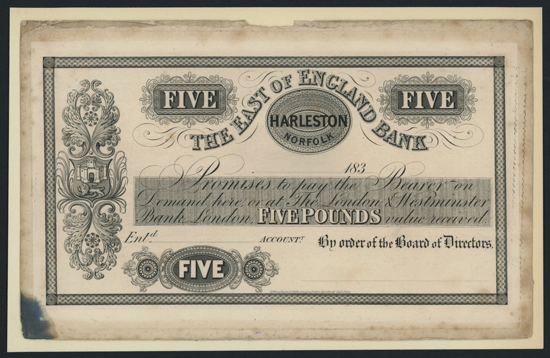 The East of England Bank, proof £5, Harleston, dated 183-,
