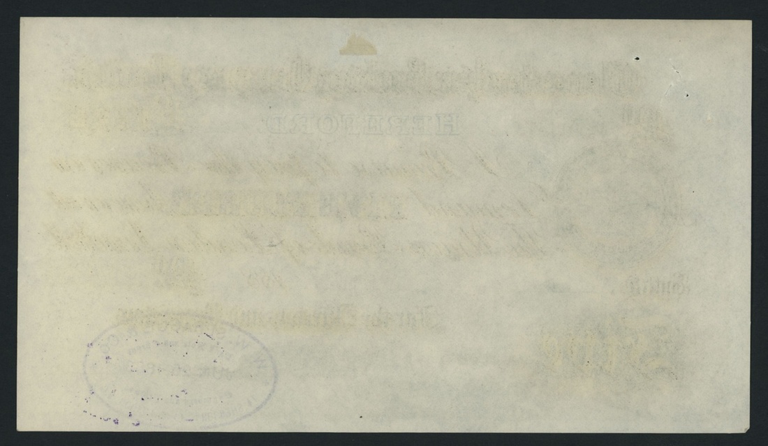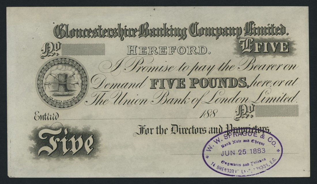 Gloucestershire Banking Company Limited, proof £5, Hereford, dated 188-, circa. 1882-1886, stamped 'W. W. SPRAGUE JUN 25 1883', uniface,