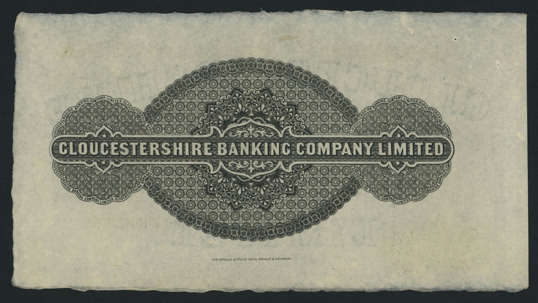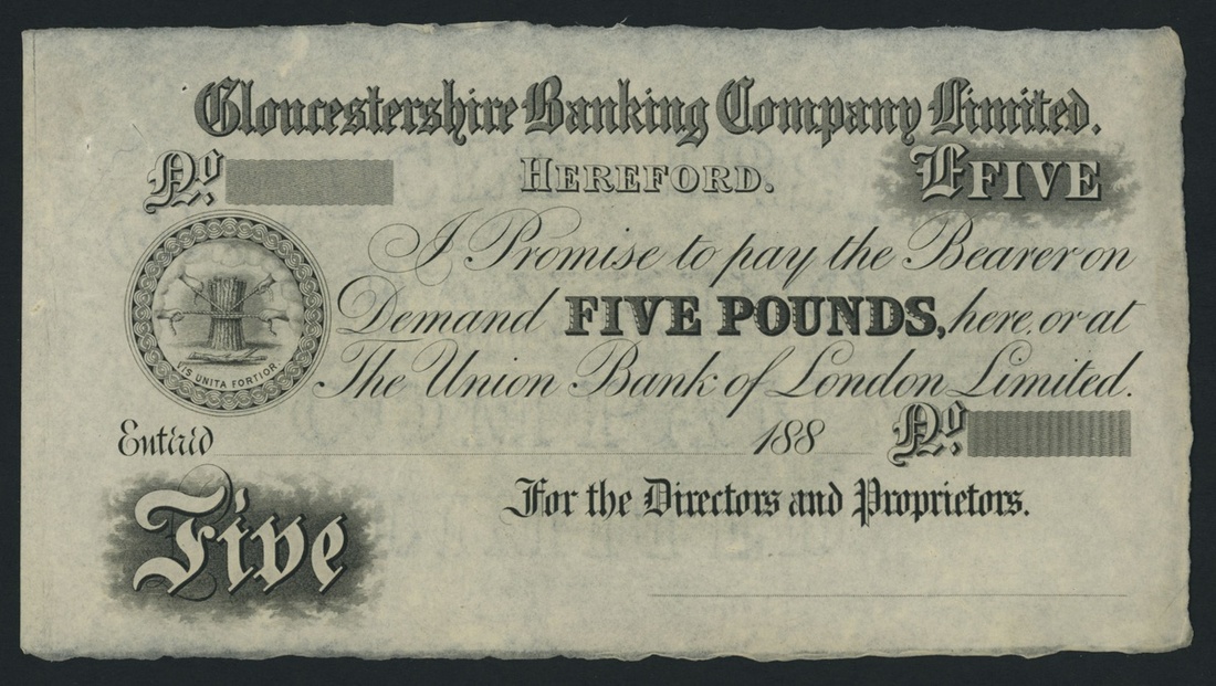 Gloucestershire Banking Company Limited, proof £5, Hereford, dated 188-, circa. 1882-1886, obverse and reverse designs,