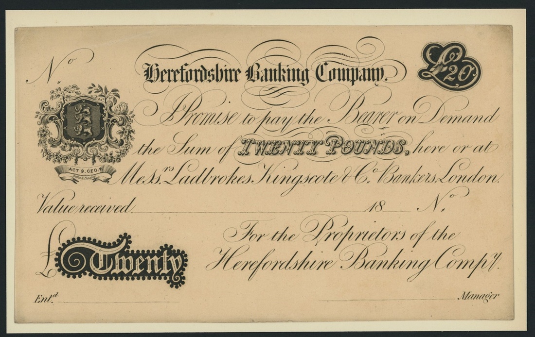 Herefordshire Banking Company, proof £20, no branch, dated 18--, no branch is mentioned however the Head Office of the Herefordshire Banking Company is Hereford and is listed circa. 1836-1863 under Outing 939. However, the £20 denomination is unlisted, uniface,