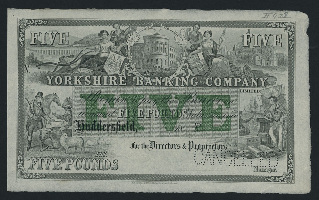 Yorkshire Banking Company Limited, proof £5, Huddersfield, 18--, perforated 'CANCELLED', with underprint, obverse and reverse designs,