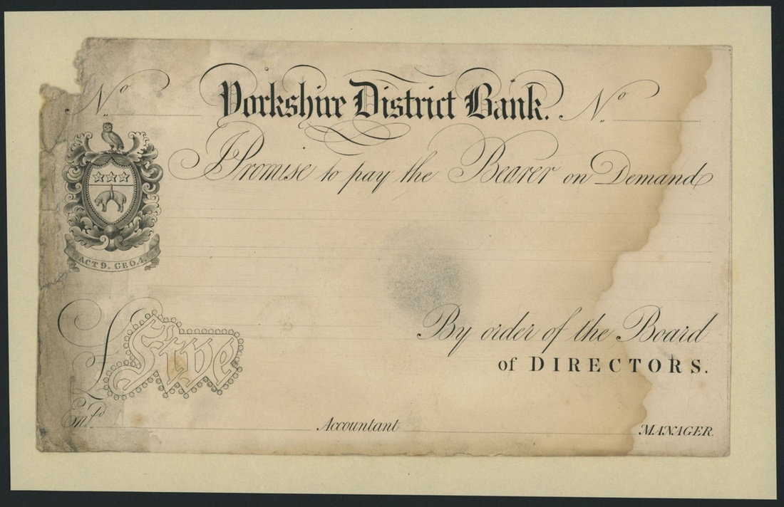 Yorkshire District Bank, proof £5, undated, Yorkshire District Bank unlisted in Outing, however it is most likely associated with Yorkshire District Banking Company circa. 1834, and was taken over by the Yorkshire Banking Company in 1843, no branch named but the note features the coat of arms of Leeds, which was the Head Office of the Yorkshire Banking Company, uniface,