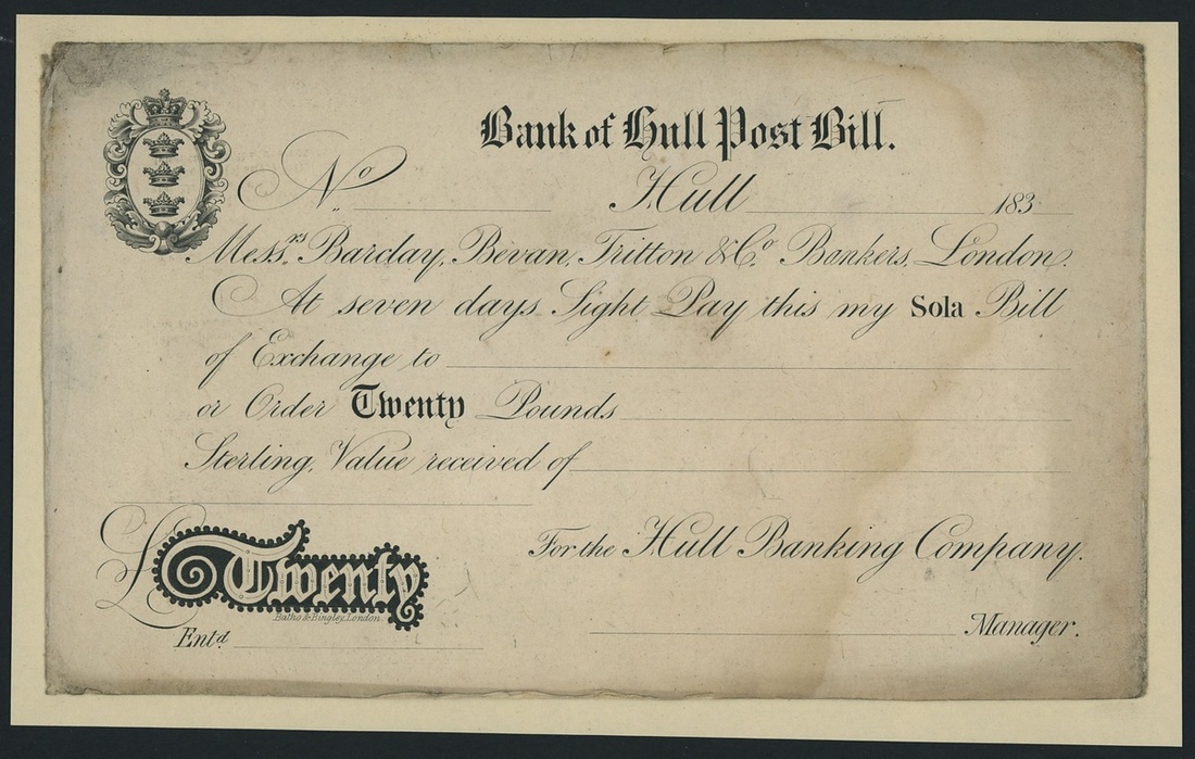 Bank of Hull Post Bill, proof £20, Hull, dated 183-, uniface,