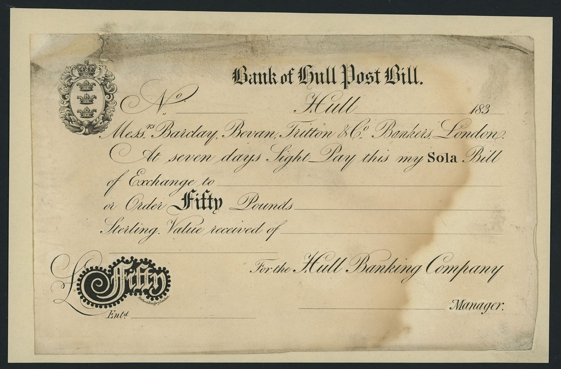 Bank of Hull Post Bill, proof £50, Hull, dated 183-, uniface,