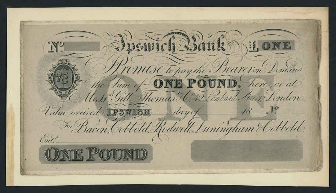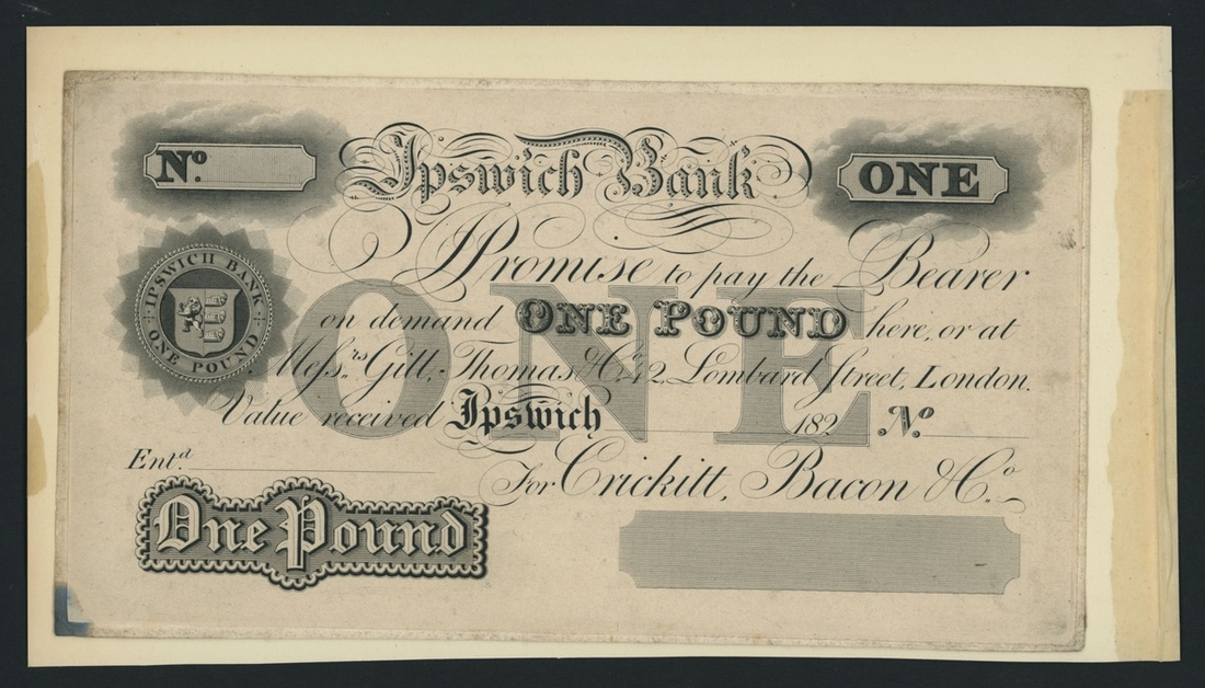 Ipswich Bank, [2 notes] proof £1, both for the Ipswich branch, dated 18-- and 182-, both with underprint, the individuals mentioned on both notes are listed circa. 1807-1877 under Outing 1045, uniface,