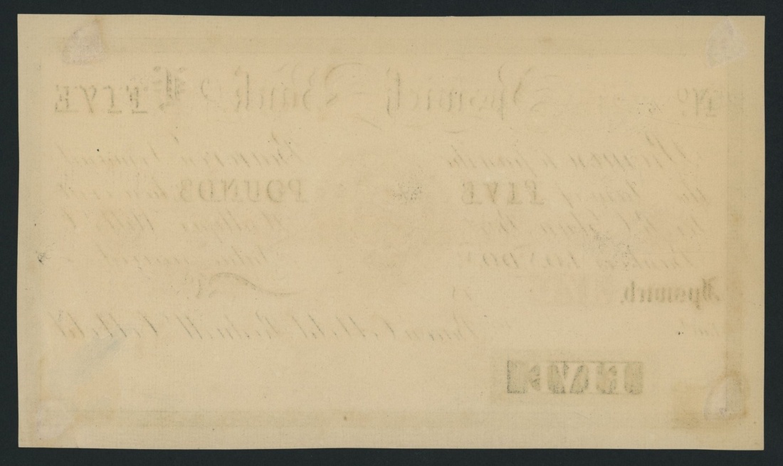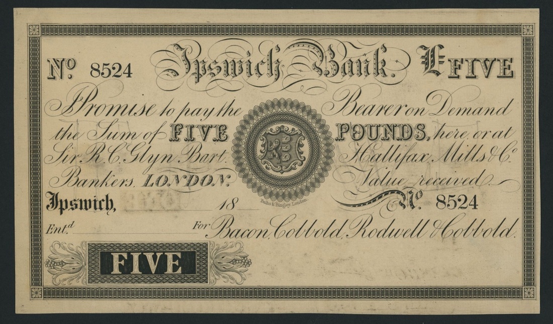 Ipswich Bank, Proof, £5, Ipswich, 18-- (circa. 1877), serial number 8524, notes 'not seen' for Bacon Cobbold and Rodwell Cobbold,