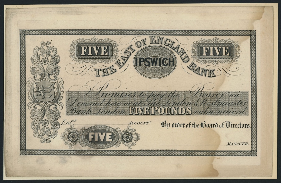 The East of England Bank, proof £5, Ipswich, dated 183-,