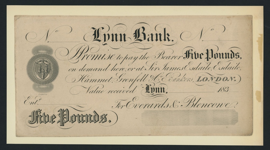 Lynn Bank, proof £5, Lynn, dated 183-, Everards & Blencowe are listed circa. 1826-1829 under Outing 1073 for King's Lynn (or Lynn Regis), however notes are 'not seen', uniface,