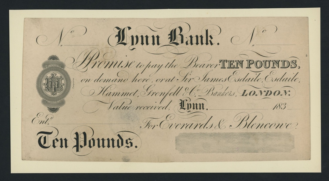 Lynn Bank, proof £10, Lynn, dated 183-, Everards & Blencowe are listed circa. 1826-1829 under Outing 1073 for King's Lynn (or Lynn Regis), however notes for this bank are 'not seen', uniface,