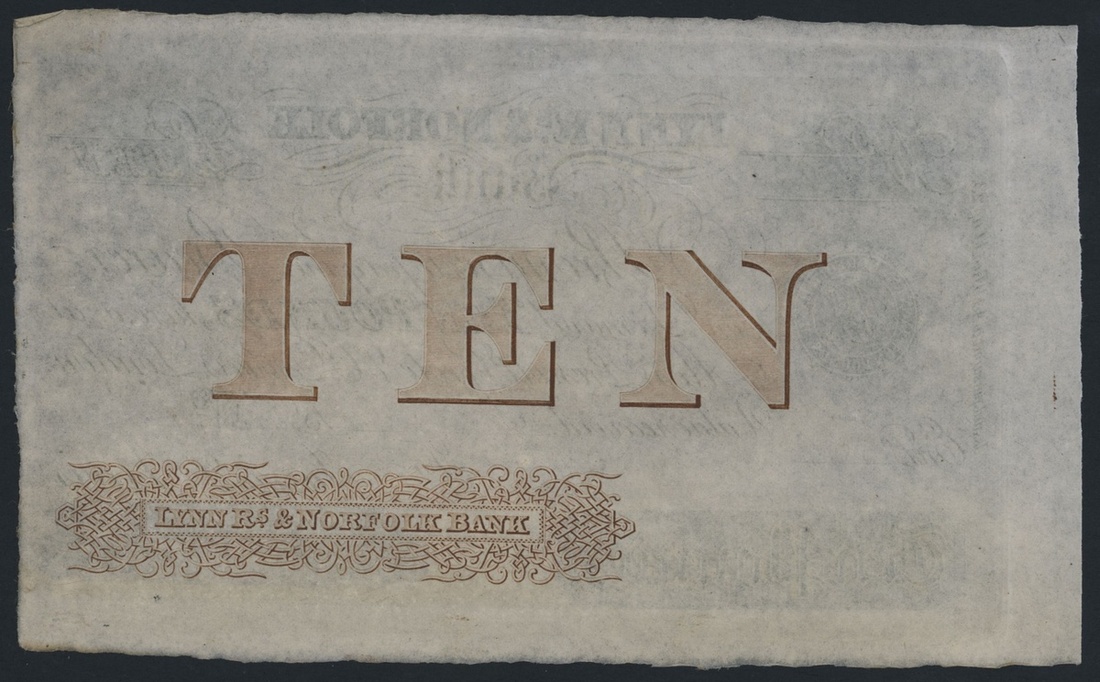 Lynn Rs [sic] & Norfolk Bank, proof £5, dated 18--, with coloured reverse, Jarvis and Jarvis are listed circa. 1883-1888 under Outing 1075, obverse and reverse designs,