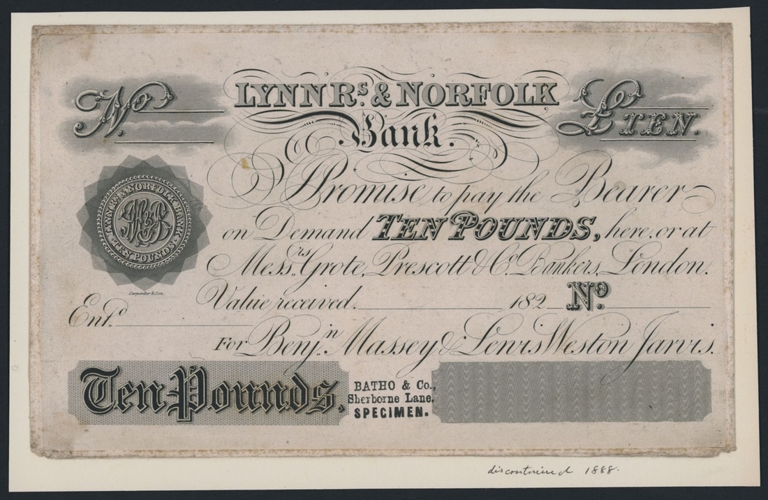 Lynn Rs [sic] & Norfolk Bank, specimen £10, dated 18--, stamped 'BATHO& Co. SPECIMEN', Benj. Massey & Lewis Weston Jarvis are listed until circa. 1847 under Outing 1075 but the £10 denomination is unlisted in associated with these specific names, uniface,