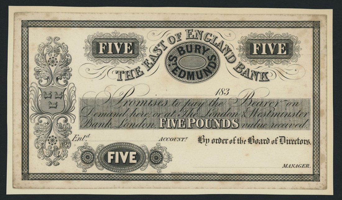 'The East of England Bank' specifically is unlisted in Outing, however East of England Banking Company, circa. 1836-1864, is listed under Outing 1612 for Norwich, which is the Head Office for this bank. The associated banks are not listed under Bury St Edmunds in Outing, uniface,