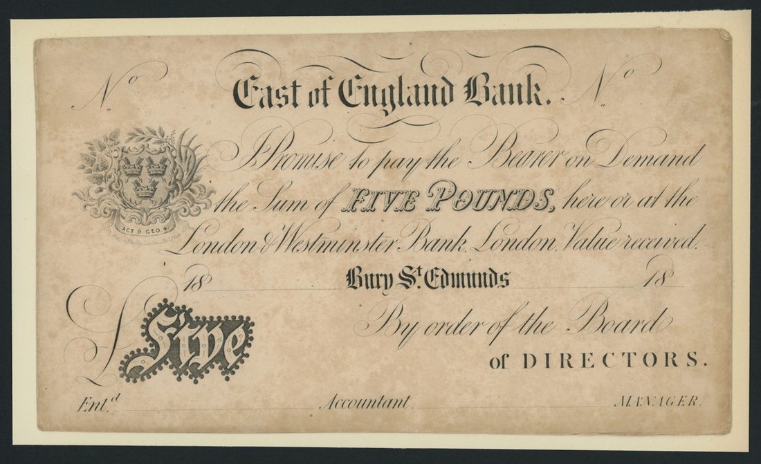 The East of England Bank, proof £5, Bury St Edmunds, dated 18--,