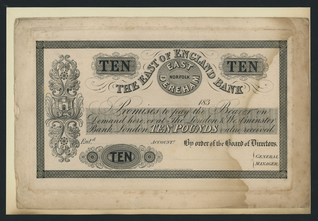The East of England Bank, proof £10, East Dereham, dated 183-,