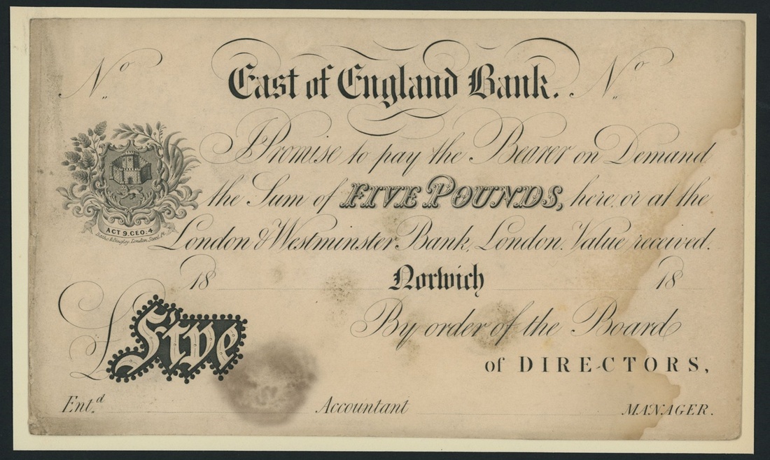 The East of England Bank, proof £5, Norwich, dated 183-,
