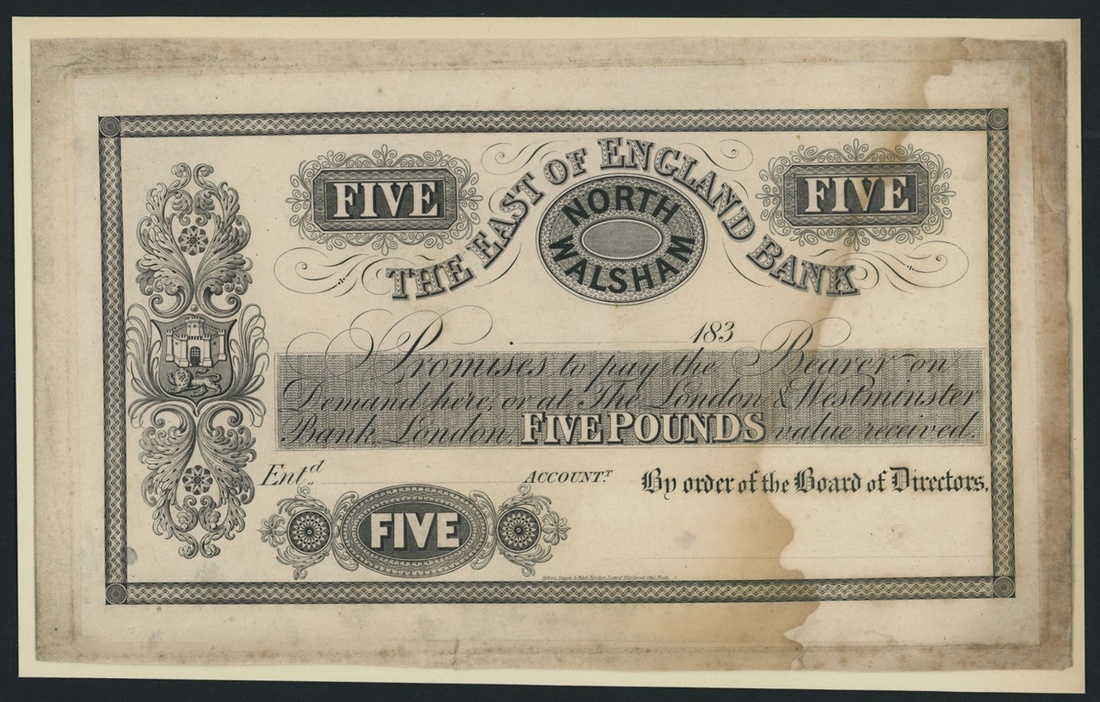 The East of England Bank, proof £5, North Walsham, dated 183-,
