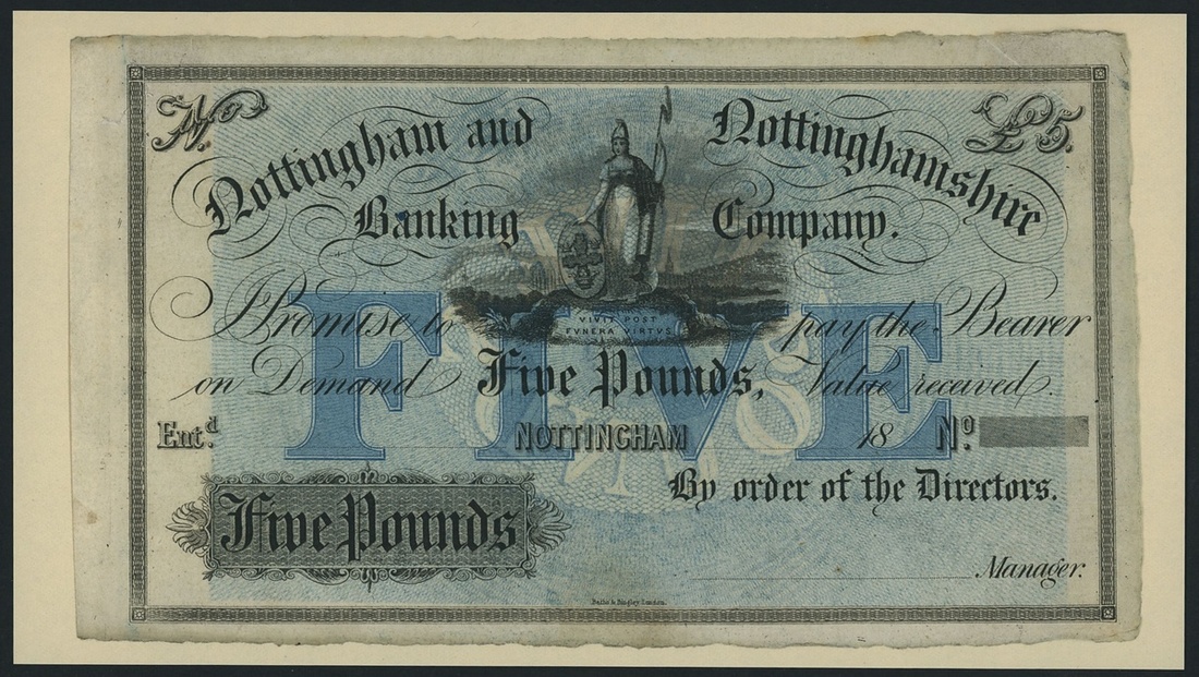 Nottingham and Nottinghamshire Banking Company, unissued £5, Nottingham, dated 18--, obverse and reverse designs, with underprint,