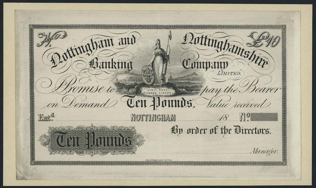 Nottingham and Nottinghamshire Banking Company, proof £10, Nottingham, dated 18--, denomination unlisted, uniface,