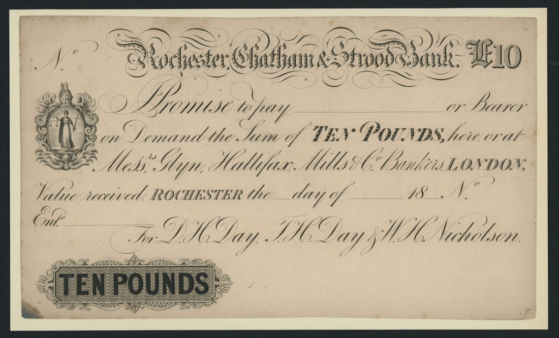 Rochester, Chatham & Strood Bank, proof £10, Rochester, dated 18--, the individual named are listed separately in Outing 1811 however the notes are mostly 'not seen' and the denomination is unlisted, uniface,