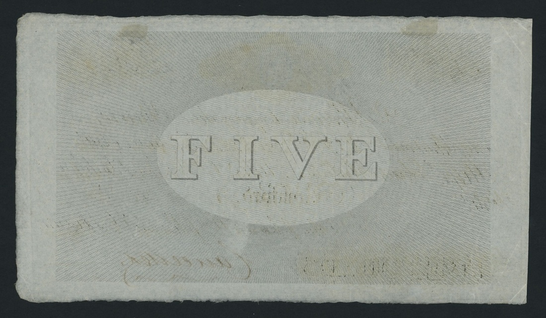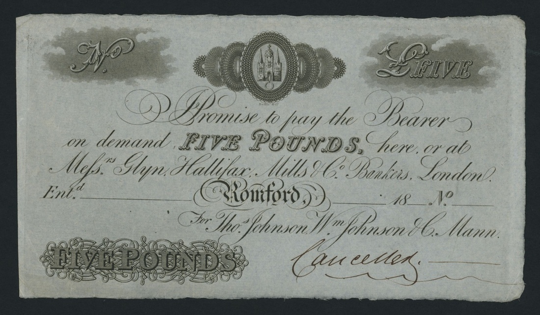 Romford Bank, proof £5, Romford, dated 18--, ink cancelled, Thomas Johnson, William Johnson & C. Mann are listed circa. 1844 under Outing 1824, obverse and reverse designs,