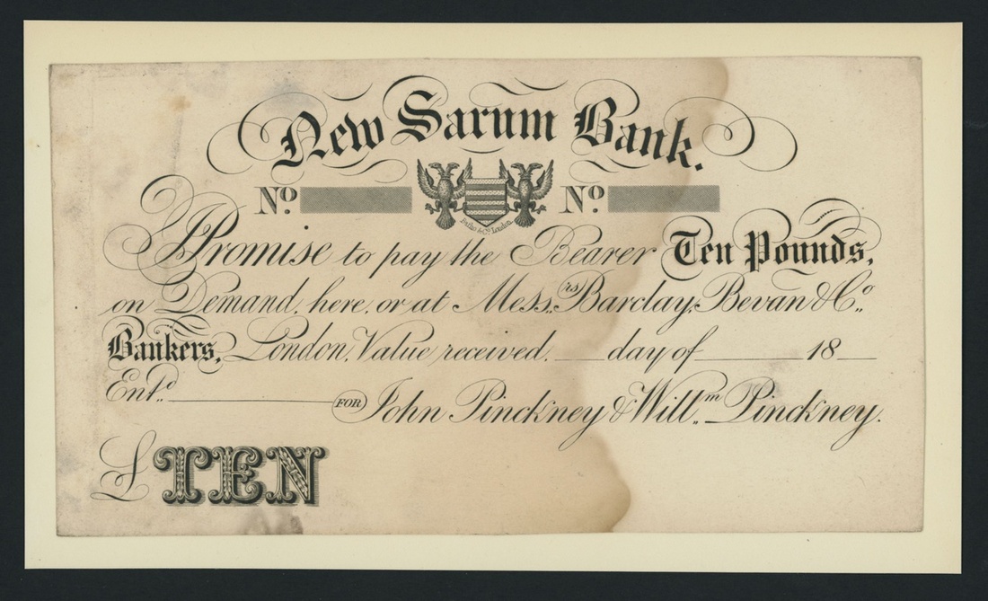 New Sarum Bank, proof £10, dated 18--, John Pinckney & William Pinckney are listed in association with Salisbury Old Bank. Both Salisbury Old Bank and New Sarum Bank are listed under Outing 1888, uniface,