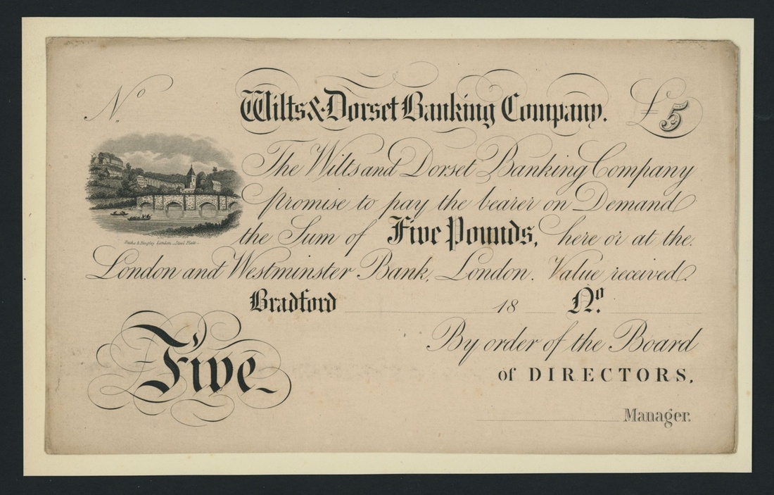 Wilts & Dorset Banking Company Limited, proof £5, Bradford, dated 18--,