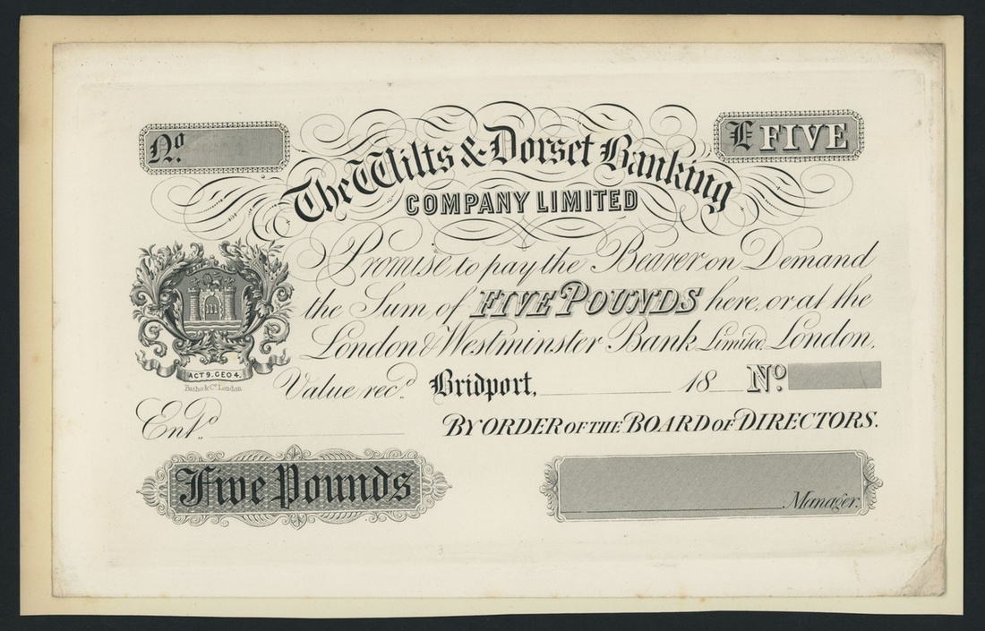 The Wilts & Dorset Banking Company Limited, proof £5, Bridport, dated 18--,
