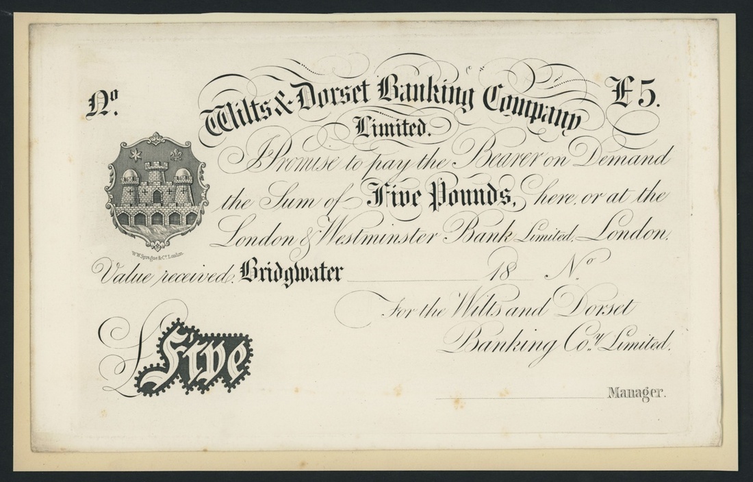 Wilts & Dorset Banking Company Limited, proof £5, Bridgwater dated 18--,