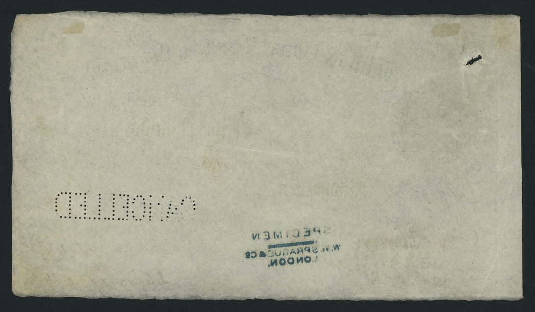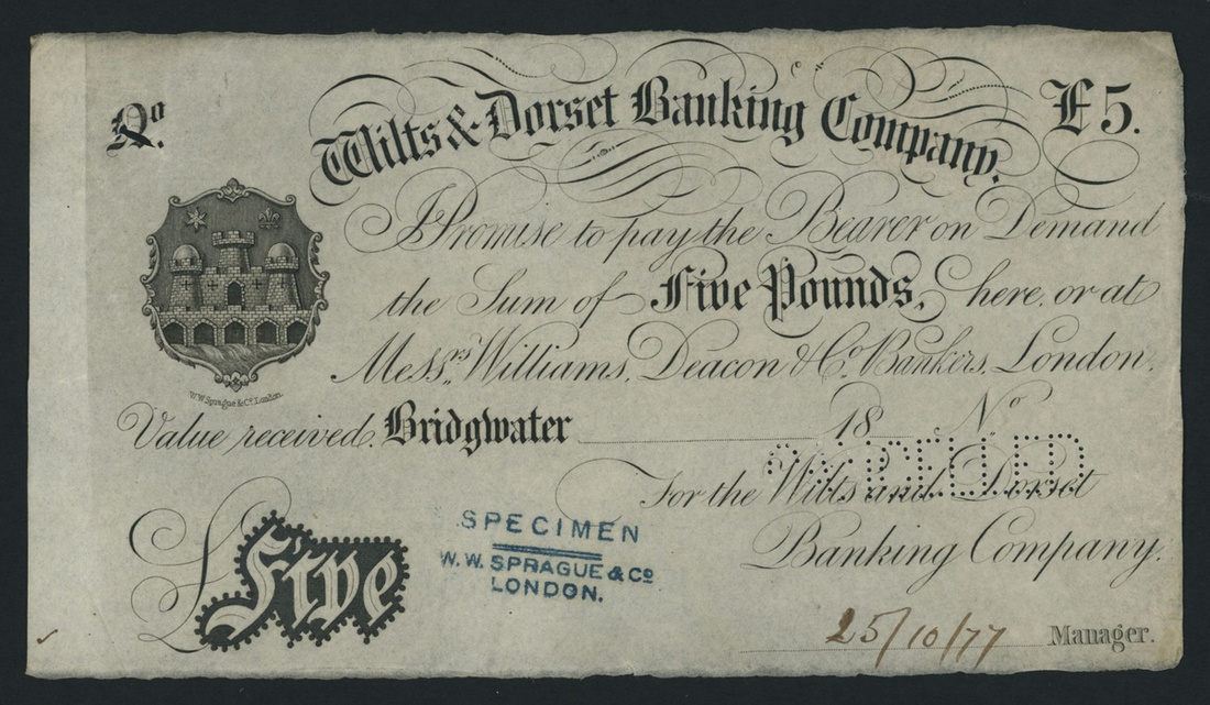 Wilts & Dorset Banking Company, specimen £5, Bridgwater, dated 18--, perforated 'CANCELLED', stamped 'SPECIMEN W. W. SPRAGUE', the Wilts & Dorset Banking Company circa. 1835-1883 is listed under Outing 1890 for Salisbury, which is the Head Office for this bank. This bank is unlisted in Outing in association with Bridgwater, uniface,