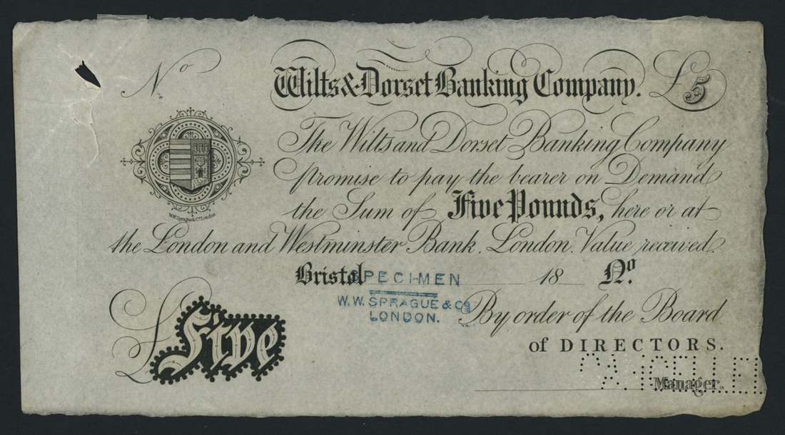 Wilts & Dorset Banking Company, specimen £5, Bristol, dated 18--, perforated 'CANCELLED', stamped 'SPECIMEN W. W. SPRAGUE', the Wilts & Dorset Banking Company circa. 1835-1883 is listed under Outing 1890 for Salisbury, which is the Head Office for this bank. This bank is unlisted in Outing in association with Bristol, uniface,